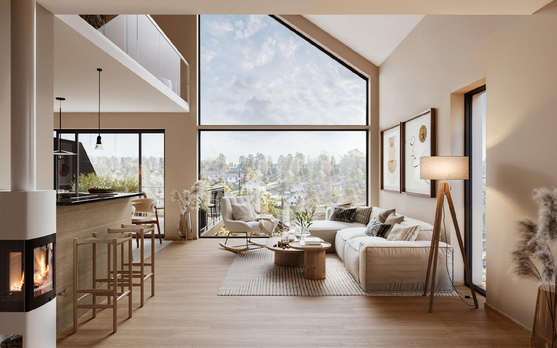 - Stor åpen stue- og kjøkkenløsning med god takhøyde og utstrakte vindusflater.